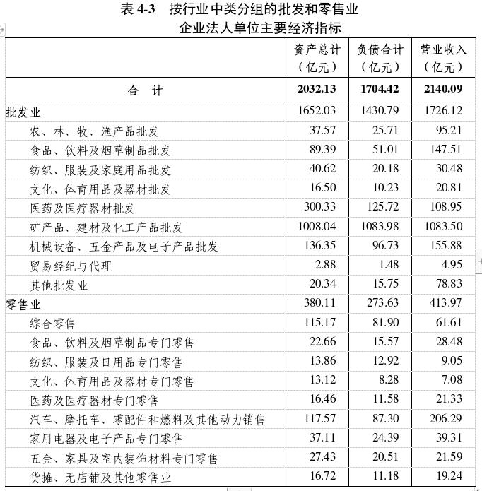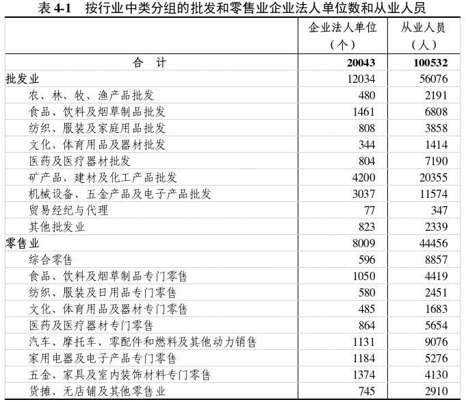 在批發(fā)和零售業(yè)企業(yè)法人單位中,批發(fā)業(yè)占60.0%,零售業(yè)占40.0%。在批發(fā)和零售業(yè)企業(yè)法人單位從業(yè)人員中,批發(fā)業(yè)占55.8%,零售業(yè)占44.2%(詳見(jiàn)表4-1)。