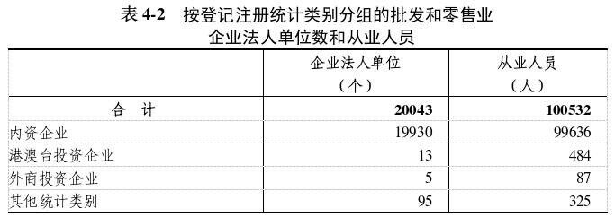 在批發(fā)和零售業(yè)企業(yè)法人單位從業(yè)人員中,內(nèi)資企業(yè)占99.1%,港澳臺(tái)投資企業(yè)占0.5%,外商投資企業(yè)占0.1%(詳見(jiàn)表4-2)。