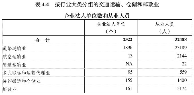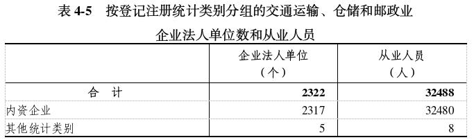 在交通運(yùn)輸、倉(cāng)儲(chǔ)和郵政業(yè)企業(yè)法人單位從業(yè)人員中,內(nèi)資企業(yè)占99.98%(詳見(jiàn)表4-5)。