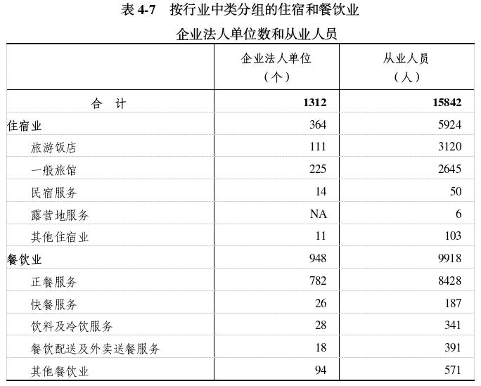 在住宿和餐飲業(yè)企業(yè)法人單位中,住宿業(yè)占27.7%,餐飲業(yè)占72.3%。在住宿和餐飲業(yè)企業(yè)法人單位從業(yè)人員中,住宿業(yè)占37.4%,餐飲業(yè)占62.6%(詳見(jiàn)表4-7)。?