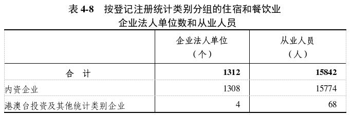 在住宿和餐飲業(yè)企業(yè)法人單位從業(yè)人員中,內(nèi)資企業(yè)占99.57%,港澳臺(tái)投資及其他統(tǒng)計(jì)類(lèi)別企業(yè)占0.43%(詳見(jiàn)表4-8)。