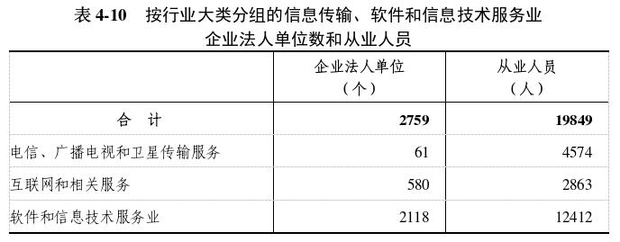 2023年末,全市共有信息傳輸、軟件和信息技術(shù)服務(wù)業(yè)企業(yè)法人單位2759個(gè),從業(yè)人員19849人,分別比2018年末增長(zhǎng)209.0%和78.4%(詳見(jiàn)表4-10)。