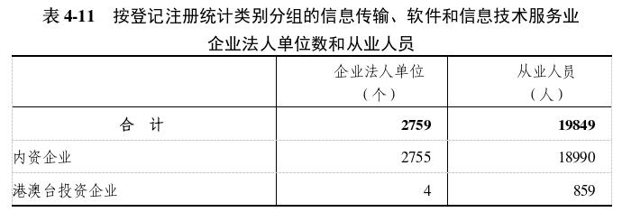 在信息傳輸、軟件和信息技術(shù)服務(wù)業(yè)企業(yè)法人單位從業(yè)人員中,內(nèi)資企業(yè)占95.7%,港澳臺(tái)投資企業(yè)占4.3%(詳見(jiàn)表4-11)。