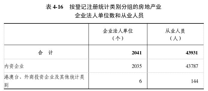 在房地產(chǎn)業(yè)企業(yè)法人單位從業(yè)人員中,內(nèi)資企業(yè)占99.96%,港澳臺(tái)、外商投資企業(yè)及其他統(tǒng)計(jì)類(lèi)別占0.04%(詳見(jiàn)表4-16)。