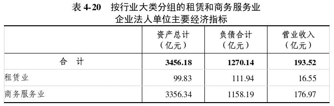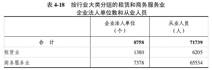 在租賃和商務(wù)服務(wù)業(yè)企業(yè)法人單位中,租賃業(yè)占15.8%,商務(wù)服務(wù)業(yè)占84.2%。在租賃和商務(wù)服務(wù)業(yè)企業(yè)法人單位從業(yè)人員中,租賃業(yè)占8.7%,商務(wù)服務(wù)業(yè)占91.4%(詳見(jiàn)表4-18)。
