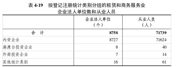 在租賃和商務(wù)服務(wù)業(yè)企業(yè)法人單位從業(yè)人員中,內(nèi)資企業(yè)占99.84%,港澳臺(tái)投資企業(yè)占0.06%,外商投資企業(yè)占0.02%(詳見(jiàn)表4-19)。