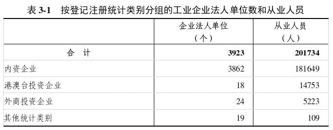 在工業(yè)企業(yè)法人單位從業(yè)人員中,內(nèi)資企業(yè)181649人,占90.0%;港澳臺投資企業(yè)14753人,占7.3%;外商投資企業(yè)5223人,占2.6%(詳見表3-1)。