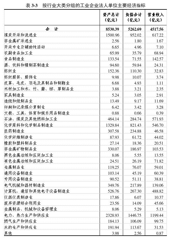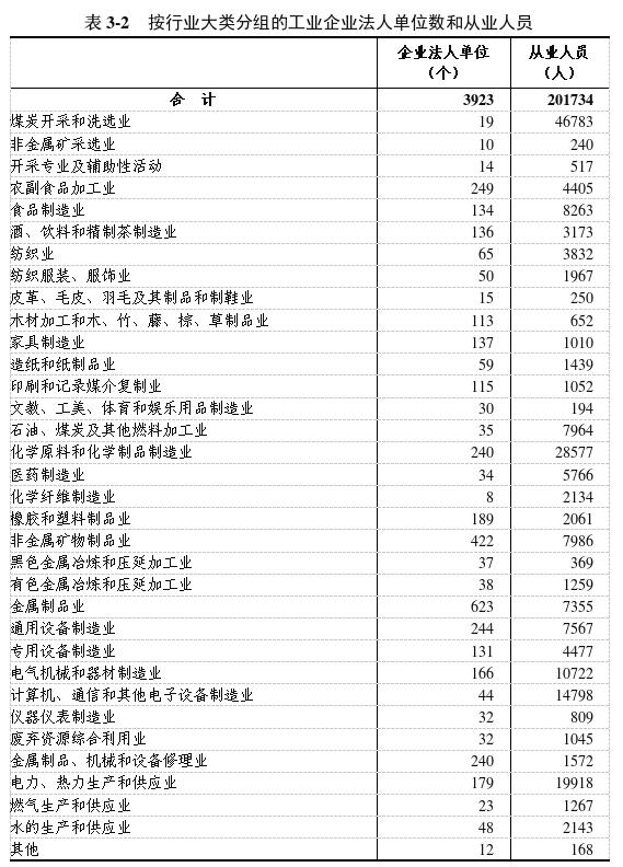 在工業(yè)企業(yè)法人單位從業(yè)人員中,采礦業(yè)47542人,制造業(yè)130864人,電力、熱力、燃?xì)饧八a(chǎn)和供應(yīng)業(yè)23328人,分別占23.6%、64.9%和11.5%。在工業(yè)行業(yè)大類中,煤炭開采和洗選業(yè),化學(xué)原料和化學(xué)制品制造業(yè),電力、熱力生產(chǎn)和供應(yīng)業(yè)從業(yè)人員數(shù)位居前三位,分別占23.2%、14.2%和9.9%(詳見表3-2)。