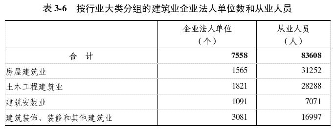 建筑業(yè)企業(yè)法人單位從業(yè)人員中,房屋建筑業(yè)占37.4%,土木工程建筑業(yè)占33.8%,建筑安裝業(yè)占8.5%,建筑裝飾、裝修和其他建筑業(yè)占20.3%(詳見表3-6)。