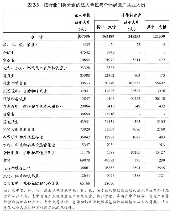 在第二產(chǎn)業(yè)和第三產(chǎn)業(yè)法人單位從業(yè)人員中,位居前三位的行業(yè)是:制造業(yè)13.09萬人,占15.3%;批發(fā)和零售業(yè)10.05萬人,占11.7%;建筑業(yè)8.33萬人,占9.7%。在個(gè)體經(jīng)營戶從業(yè)人員中,位居前三位的行業(yè)是:批發(fā)和零售業(yè)10.15萬人,占41.4%;住宿和餐飲業(yè)6.63萬人,占27.0%;居民服務(wù)、修理和其他服務(wù)業(yè)2.93萬人,占11.9%(詳見表2-3)。