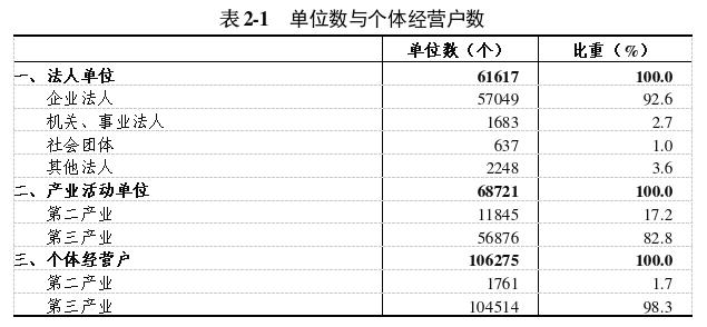 在第二產(chǎn)業(yè)和第三產(chǎn)業(yè)法人單位中,位居前三位的行業(yè)是:批發(fā)和零售業(yè)2.00萬個(gè),占32.5%;租賃和商務(wù)服務(wù)業(yè)0.88萬個(gè),占14.3%;建筑業(yè)0.76萬個(gè),占12.3%。在個(gè)體經(jīng)營戶中,位居前三位的行業(yè)是:批發(fā)和零售業(yè)5.27萬個(gè),占49.6%;住宿和餐飲業(yè)1.80萬個(gè),占16.9%;交通運(yùn)輸、倉儲(chǔ)和郵政業(yè)1.36萬個(gè),占12.8%(詳見表2-2)。